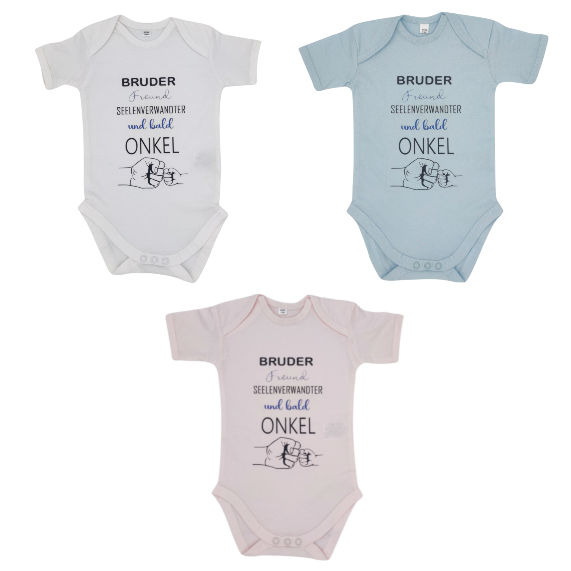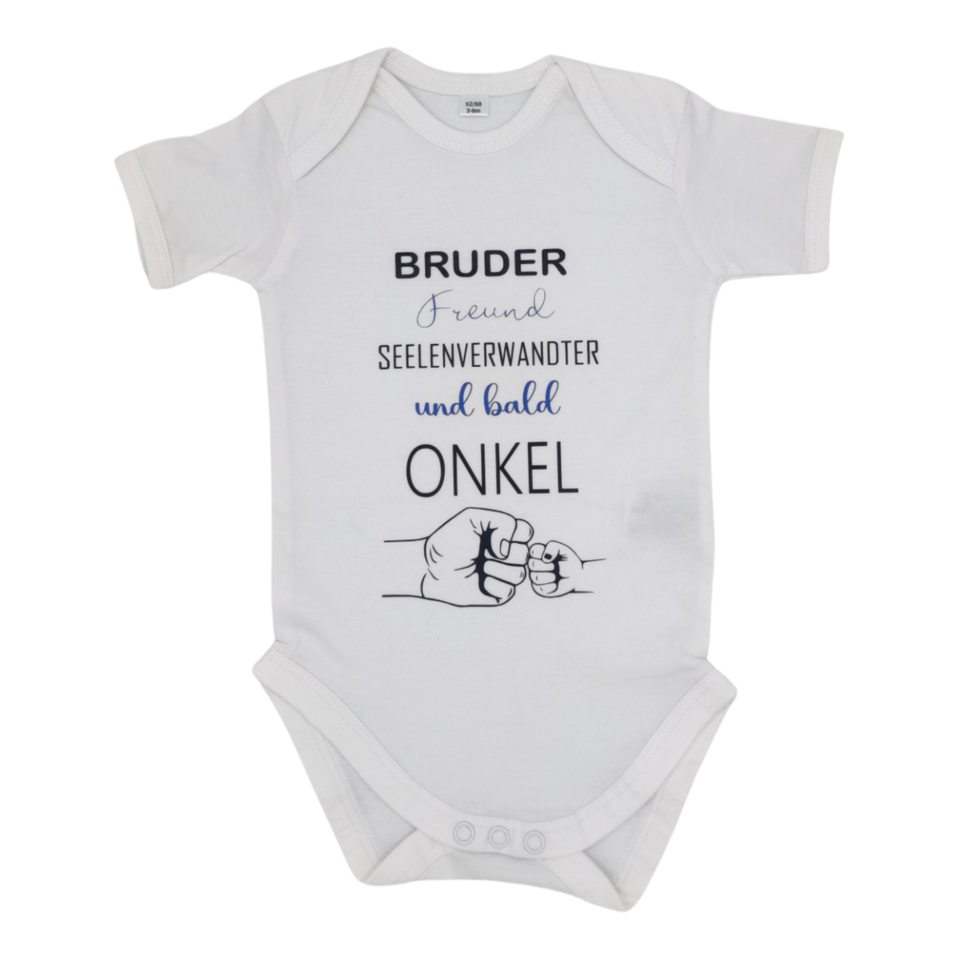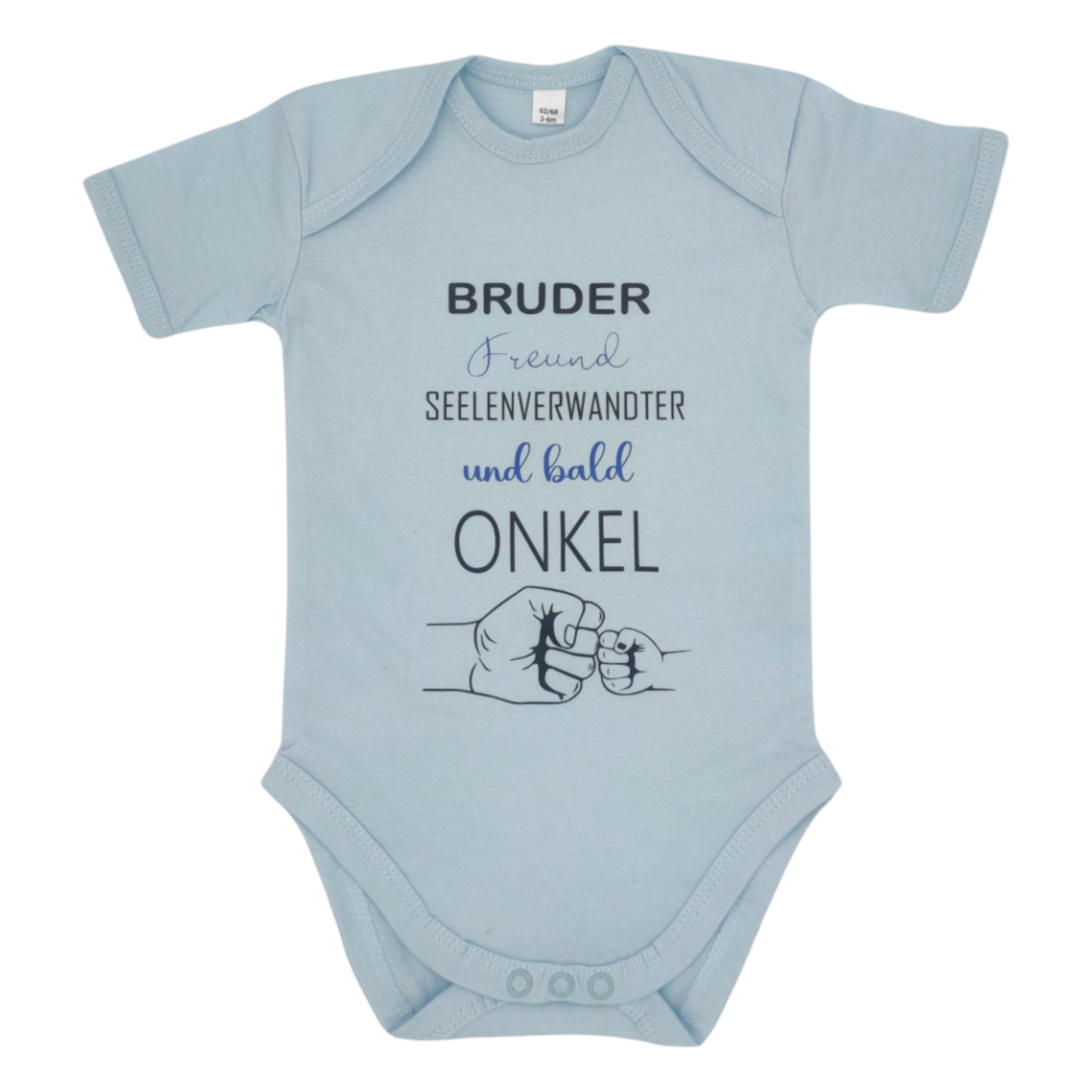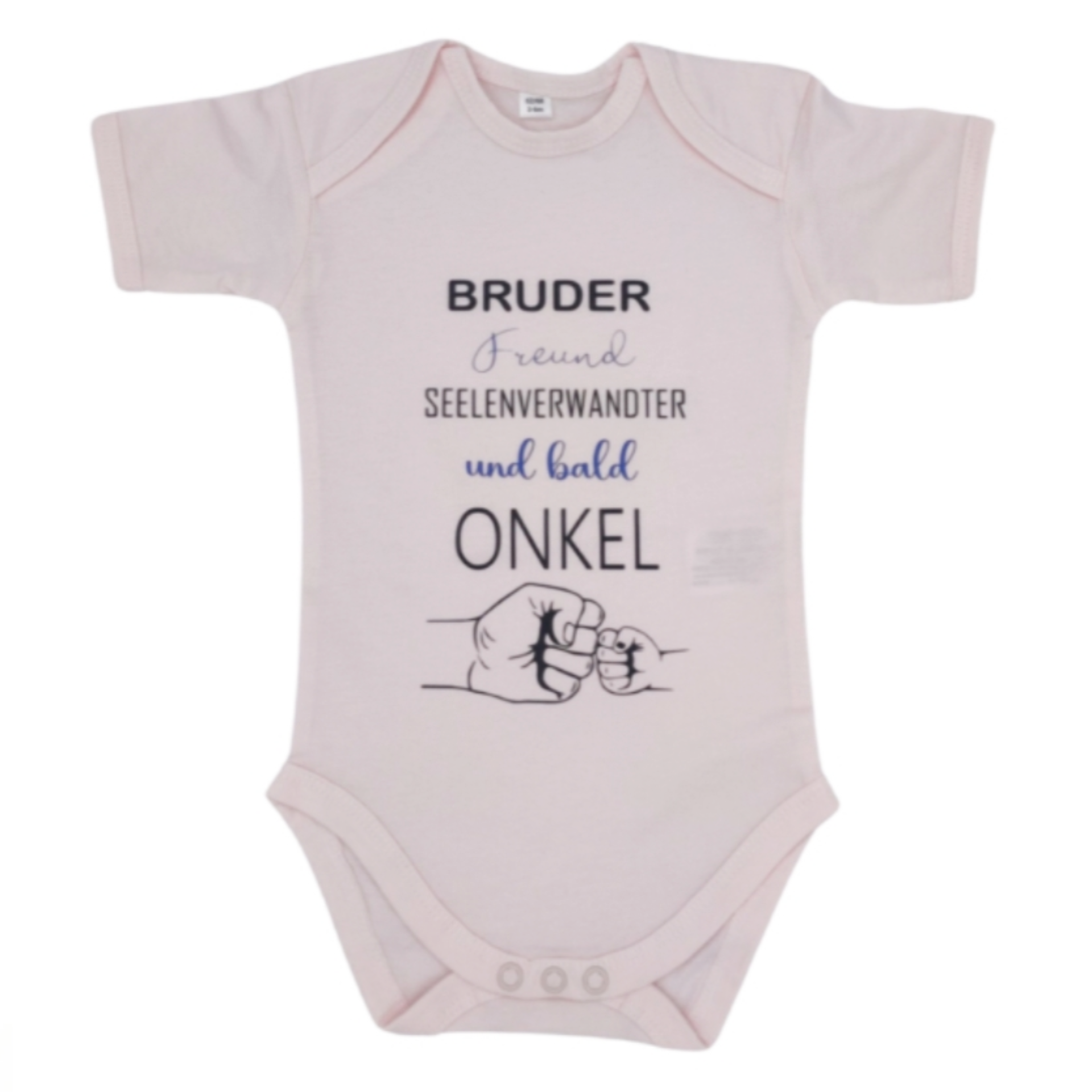 Kurzarm Babybody mit der Aufschrift: Bruder,Freund, Seelenverwandter und bald Onkel.