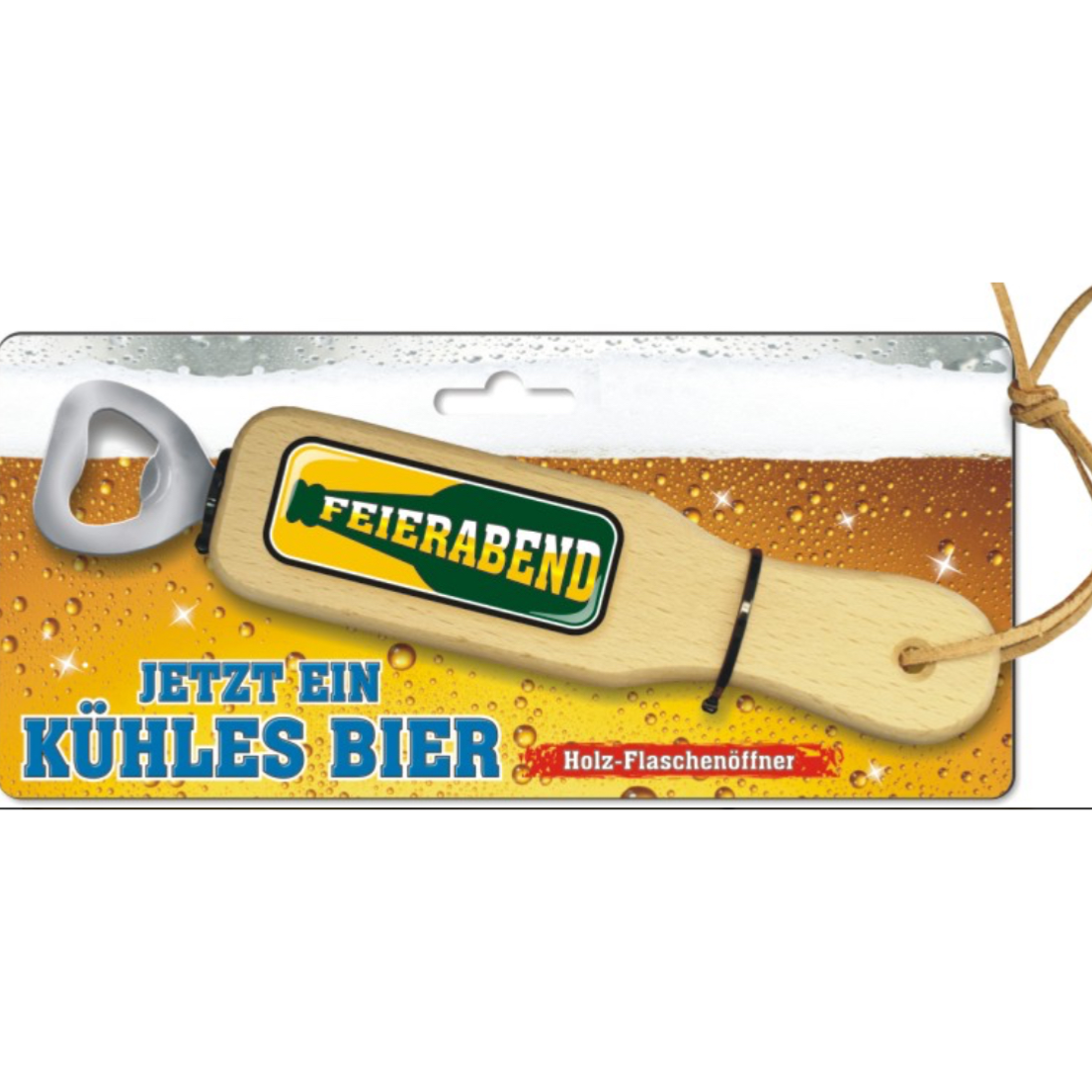 Holzflaschenöffner mit Biersujet, Griff aus Holz, lackiert, mit Lederriemen zum Anhängen, Öffner aus Metall, mit 3D Aufkleber! Auf farbig gedrucktem Karton.